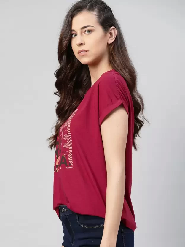 Women Printed Round Neck Pure Cotton Maroon T-Shirt